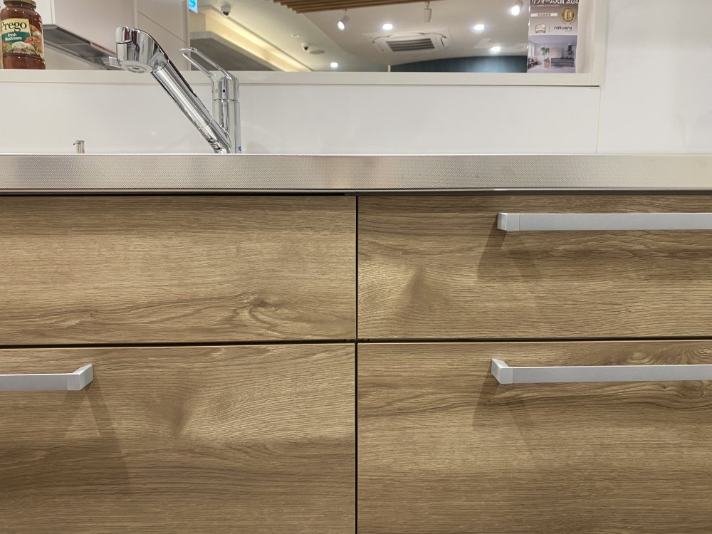 安城ショールームでは、ラクエラ本体の扉材の質感や収納の動き、ワークトップの高さなど、基本仕様を実際に触れて確認いただけます。